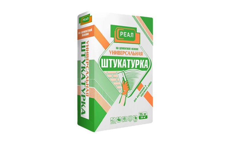 Штукатурка РЕАЛ Универсальная используется для выравнивания поверхностей из бетона, газобетона, кирпича при выполнении ремонтно-строительных работ, для внутренних и наружных работ, для ручного и машинного нанесения